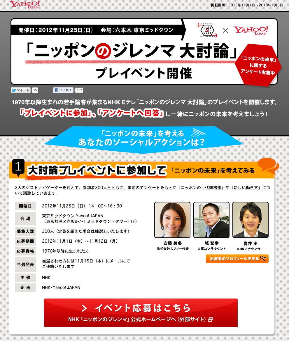2012年11月25日(日)に、NHK Eテレ×Yahoo! JAPANのコラボイベント開催「ニッポンのジレンマ 大討論 ニッポンの未来2013」が東京・六本木の東京ミッドタウンにて開催されます。