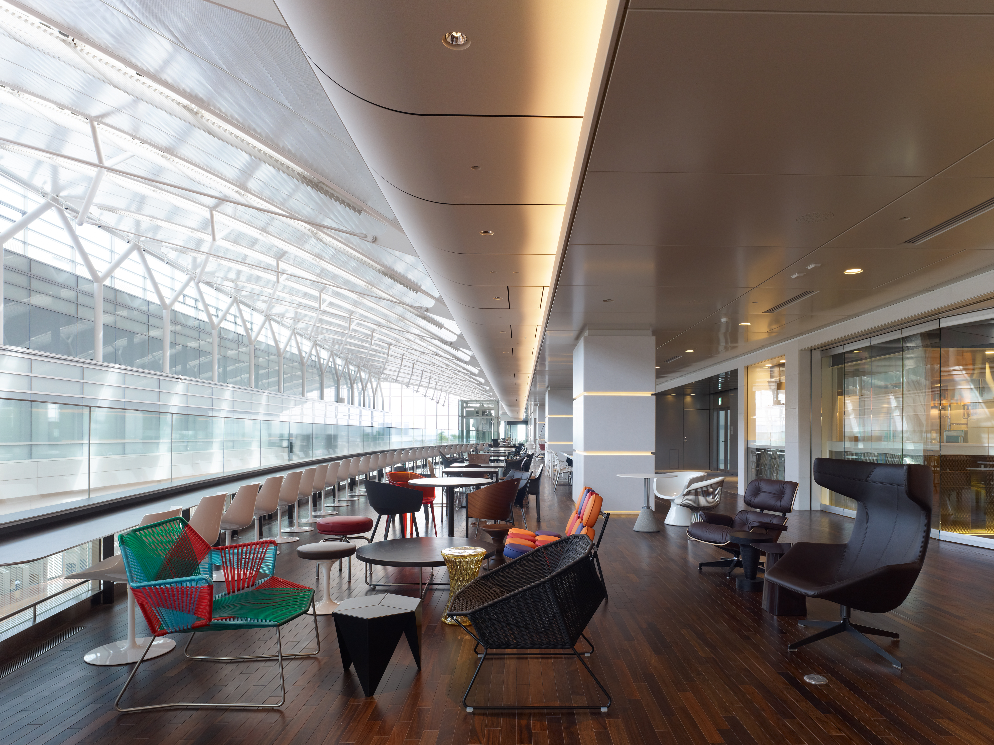 中村 当初の空間は細い廊下の先に飲食店が並んでいたのですが、僕は空港でしか味わえない臨場感こそが大切だと思いました。そこで、お店をテイクアウト専門にして最小化し、廊下を太くして、そこにフードコート的にガンガン椅子を出したんですね。座るとトップサイドライトからは雲が見えるので、これから自分が離陸する空に思いを馳せたりとか、風の流れを読んだりとか、出発ホールを見下ろして旅行鞄を持っている家族がどこに行くのかなと想像してみたりとか、そういう空港ならではの体験がつくられていくわけです。